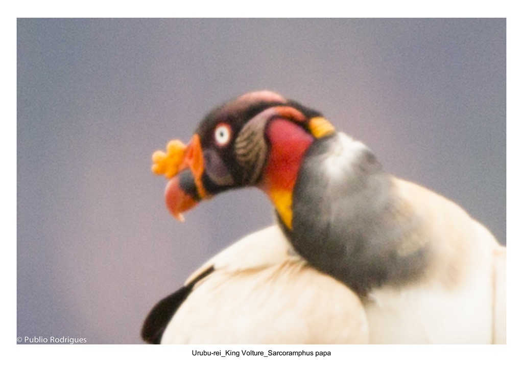 Nunca havíamos visto tão próximo; ficamos observando e fotografando por cerca de 15 minutos, quando conseguimos ver todos os detalhes coloridos de sua cabeça e a brancura esplêndida de suas penas. Podem achar estranho por ser um urubu, mas é um dos pássaros mais impressionantes da nossa fauna.