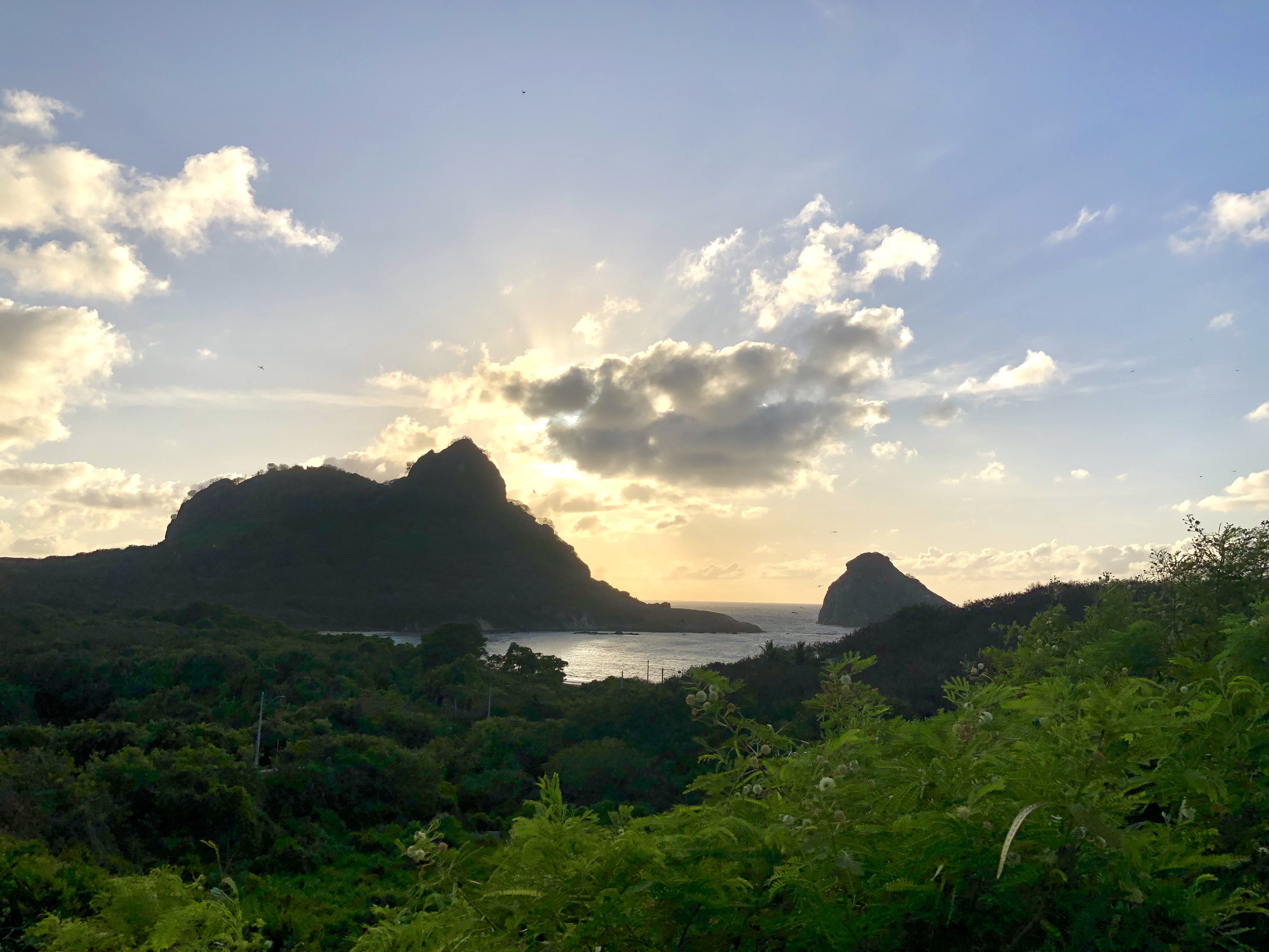 No último dia, já conhecendo um pouco dos pontos de visitação, percorremos novamente a trilha do Mirante dos Golfinhos – trilha muito bem conservada, com passarelas pela mata até chegar um mirante onde, a qualquer momento, os golfinhos podem aparecer. De lá, vimos um tubarão-tigre nadando tranquilamente, muitos ninhos e pássaros como os atobás-de-pé-vermelho, as granizas e os inúmeros trinta-réis em revoadas. Um espetáculo divino em uma paisagem resplandecente.